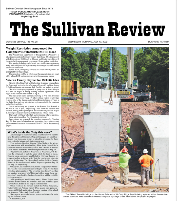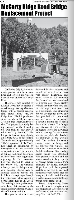 Bassett Engineering is excited to announce the completion of the third bridge under Bundle 2 of the Lycoming County Bridge Bundling Program! The brand-new concrete arch spans 16′ and 72′ long and is located on Valley Road in Susquehanna Township. A precast arch was chosen for Valley Road due to stream and site requirements. The stream crossing has been improved by increasing the hydraulic opening and capacity, providing armor against erosion along upstream and downstream embankments, and reducing scour at the outlet by lowering stream velocities through the structure. The structure was designed by Bassett Engineering of Montoursville, prepurchased by Lycoming County through the PA COSTARS Program, and the installation was completed by Wolyniec Construction of Williamsport, PA. The bridge was completed in July of 2022.